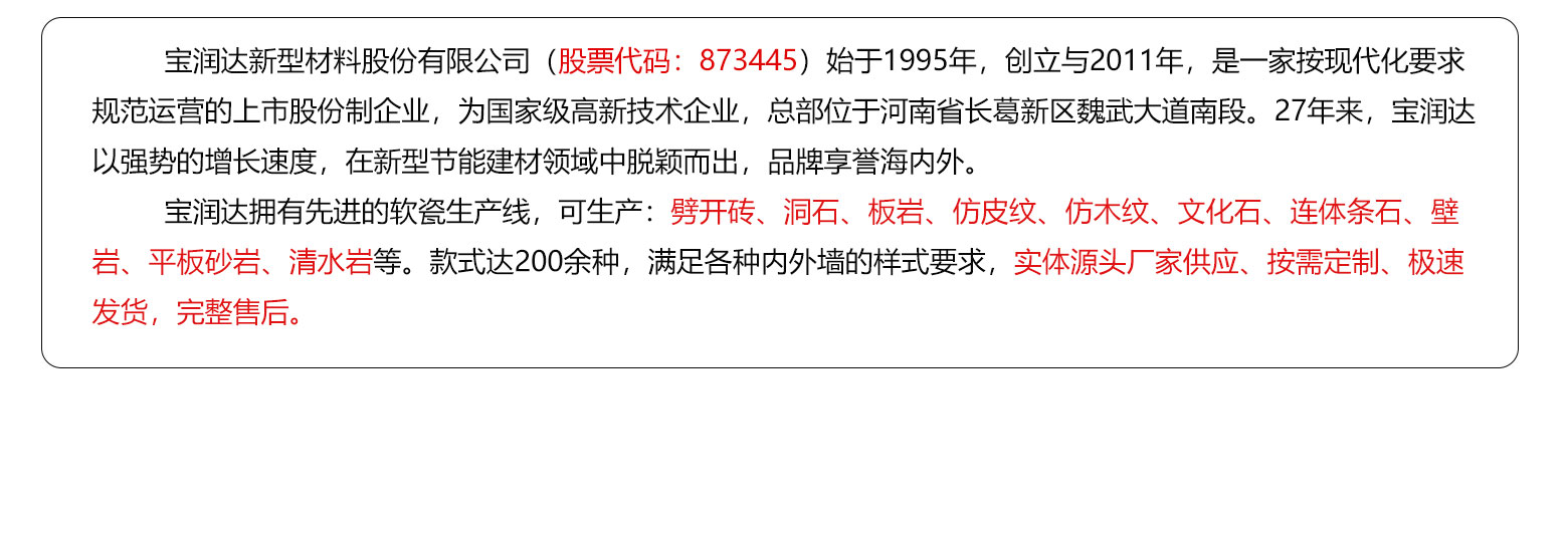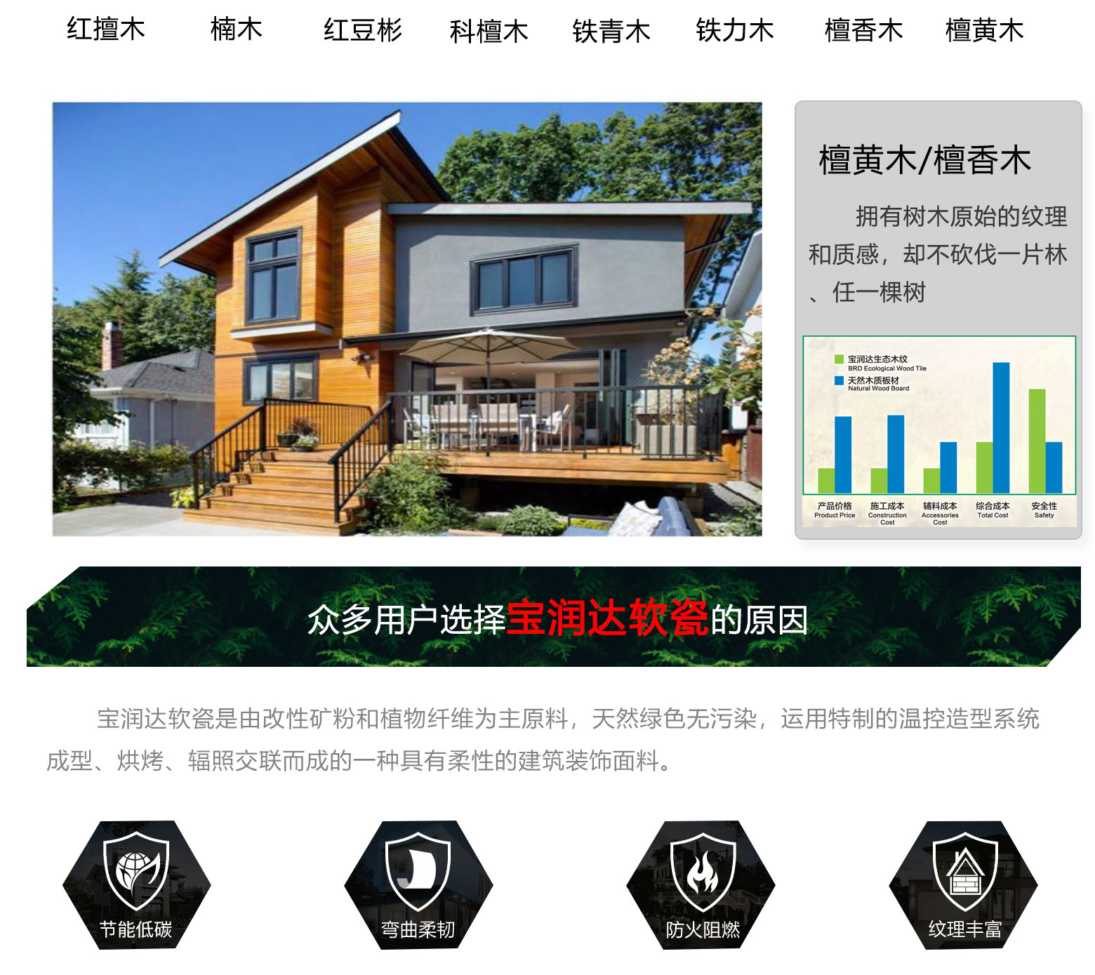 寶潤達(dá)外墻軟瓷磚:具有安全環(huán)保、抗震防裂、耐火防凍、拒水透氣、耐酸耐堿等優(yōu)良特性,表現(xiàn)力豐富,是良好的室內(nèi)外建筑飾面材料