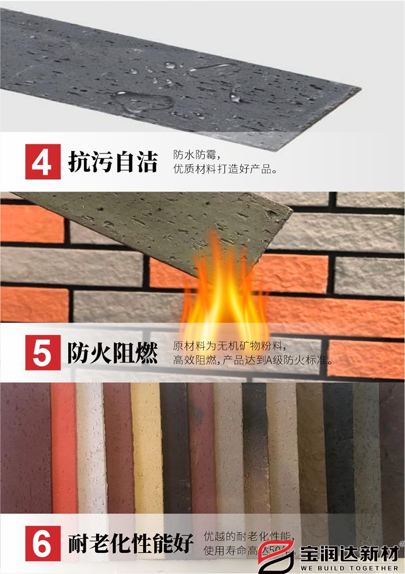 成分為無機材料,顏色來自材料本身,都為純天然色彩,顏色自然持久,不會因紫外線照射或其他外界自然條件而出現褪色。產品本身也不會出現起鼓、脫落、粉化等老化現象,有著優秀的耐久性能,可以通過國家相關檢測中心2300h的耐候實驗,遠遠高于國家行業標準柔性飾面磚所規定的。寶潤達軟瓷樣式齊全,種類多樣,可仿多種精美面材。